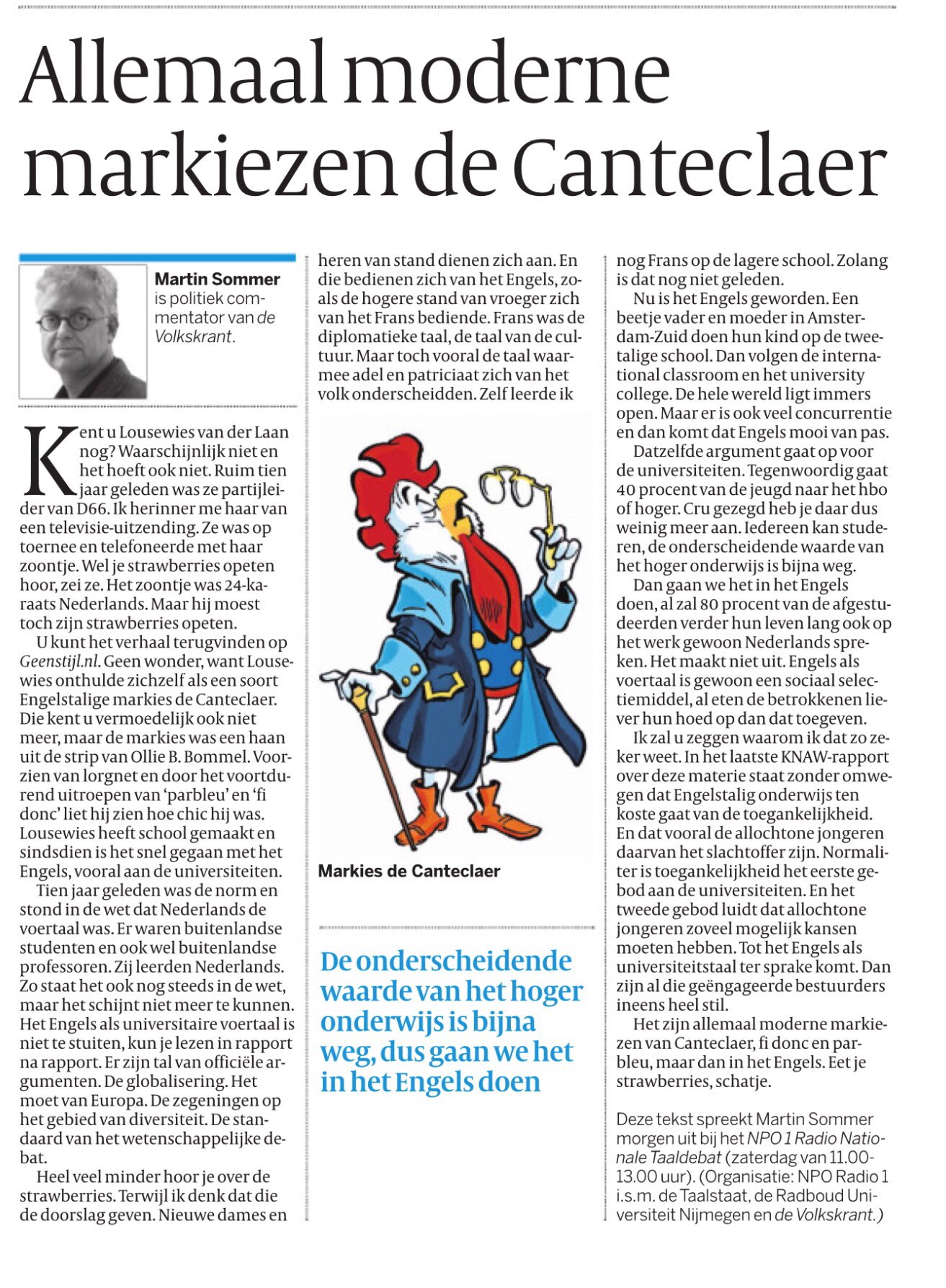 "Nieuwe dames en heren van stand dienen zich aan. En die bedienen zich van het Engels, zoals de hogere stand van vroeger zich van het Frans bediende. Frans was de diplomatieke taal, de taal van de cultuur. Maar toch vooral de taal waarmee adel en patriciaat zich van het volk onderscheidde. Zelf leerde ik nog Frans op de lagere school. Zolang is dat nog niet geleden."