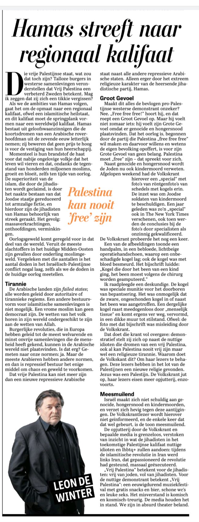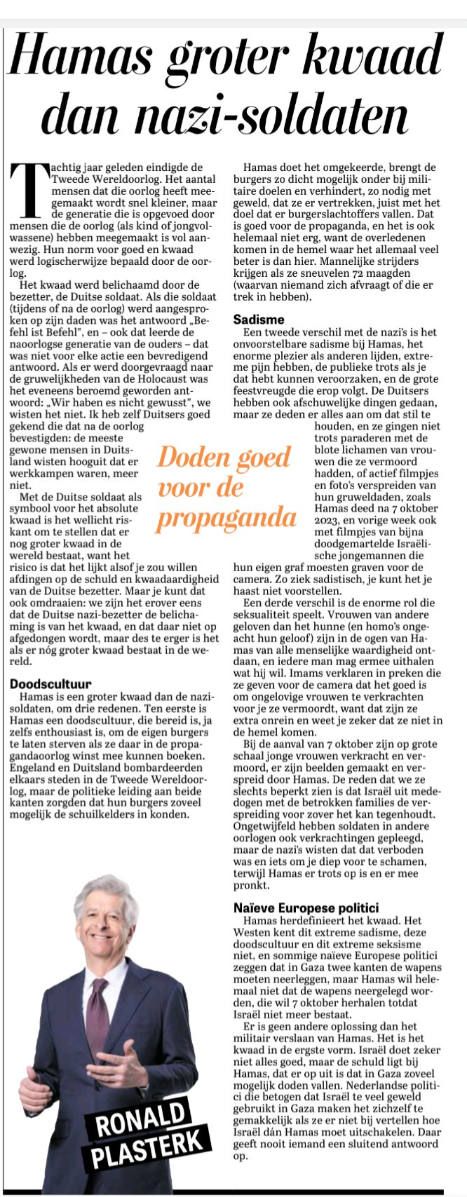 Hamas voert een oorlog die niets met verzet te maken had of heeft. De pogrom van 7 oktober 2023 was geen incident, maar de ongefilterde uitbarsting van een ideologie die al eeuwenlang genocidaal is. Ja, Palestijnen verdienen rechten. Maar wat Hamas doet is sadistisch, middeleeuws en structureel in strijd met elk beschaafd beginsel.